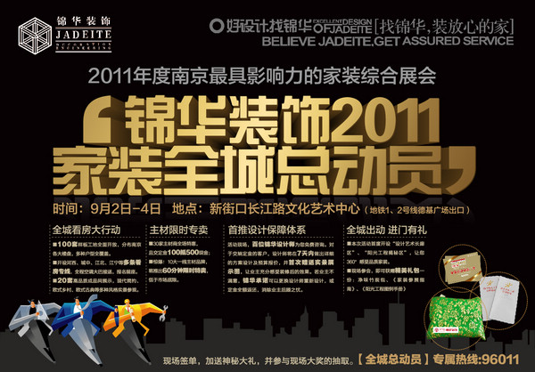 9月2日—4日,由錦華主辦的南京2011年度最具影響力的家裝綜合展會——2011南京家居建材文化節將重拳出擊,針對家裝設計潛規則,推出“設計不滿意,7天可退”的重磅舉措,一舉挑戰家裝“定金套頭規則”,這一舉措將帶動整個行業的發展與成熟。