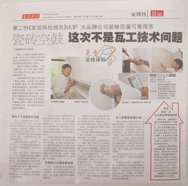 近日,南京知名媒體“金陵晚報”開通了“裝修體檢直通車”服務,邀請廣大正在裝修中的業主報名,金陵晚報將和驗房專家一起走進業主家,驗房后出具《家裝體檢報告》,幫助業主發現問題并解決問題。