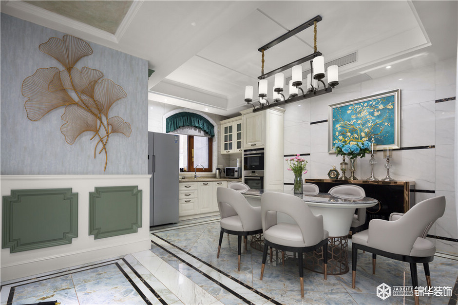 靠近餐廳的墻上,采用了別致的銀杏葉掛件,既富有文藝氣息(符合業主本身的文藝調性),又律動感十足,讓人移不開眼。